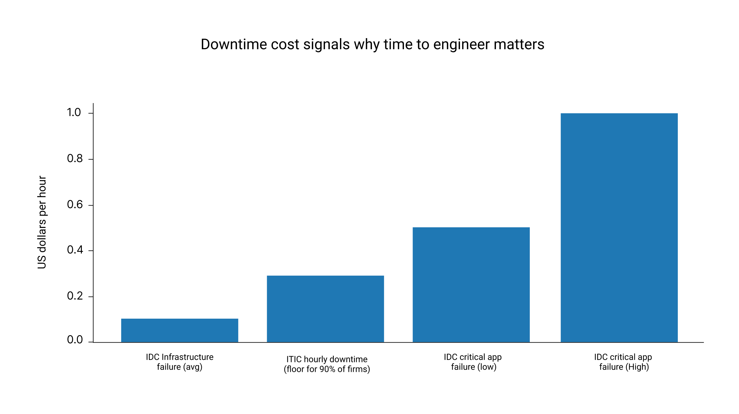 Data points compiled from ITIC (hourly downtime survey results) and IDC (DevOps and the cost of downtime). IDC DevOps and the Cost of Downtime (Fortune 1000)