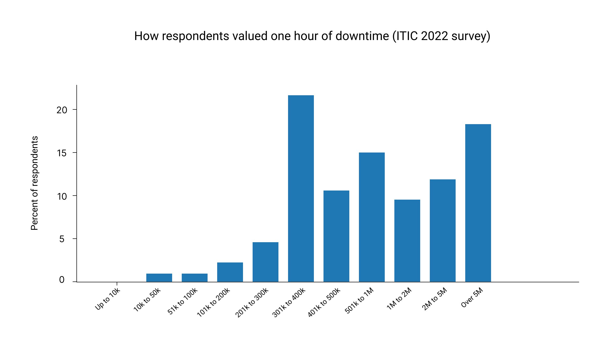 Distribution reproduced from an ITIC survey exhibit showing hourly downtime cost bands and respondent percentages. Source: ITIC 2024 survey and IDC Fortune 1000 analysis.